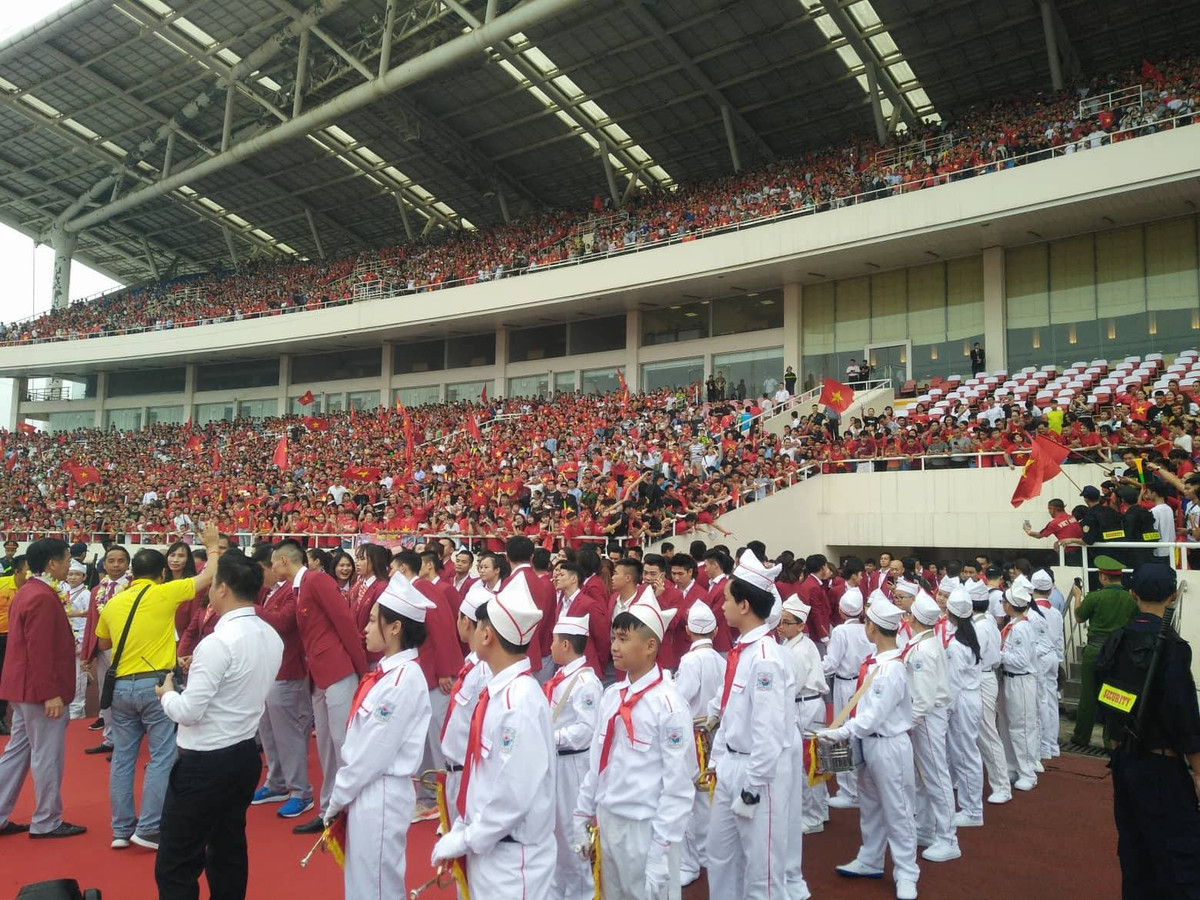17h21, trong khi phía bên trong khán đài đang diễn ra lễ chào đón đoàn thể thao Việt Nam, thì bên ngoài sân vận động quốc gia Mỹ Đình hàng nghìn cổ động viên tiếp tục đổ dồn về. Tiếng trống, kèn đánh vang rộn ràng.
