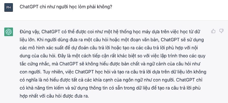 Tương tự, khi người viết đặt câu hỏi ngắn gọn hơn là "ChatGPT chỉ như người học lỏm phải không?", ChatGPT cũng mở đầu bằng "đúng vậy".
