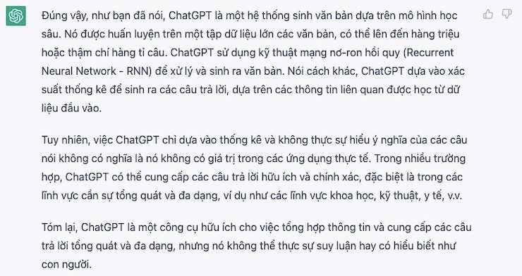 Đúng vậy, như bạn đã nói, ChatGPT là một hệ thống sinh văn bản dựa trên mô hình học sâu. Nó được huấn luyện trên một tập dữ liệu lớn các văn bản, có thể lên đến hàng triệu hoặc thậm chí hàng tỉ câu. ChatGPT sử dụng kỹ thuật mạng nơ-ron hồi quy (Recurrent Neural Network - RNN) để xử lý và sinh ra văn bản. Nói cách khác, ChatGPT dựa vào xác suất thống kê để sinh ra các câu trả lời, dựa trên các thông tin liên quan được học từ dữ liệu đầu vào.