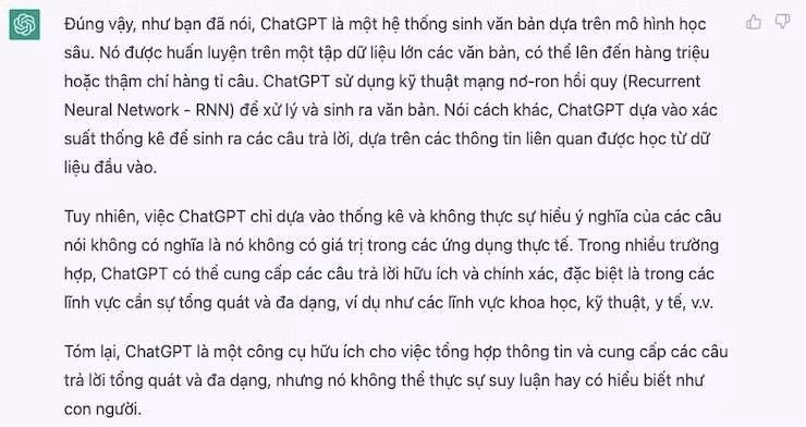 Tóm lại, ChatGPT là một công cụ hữu ích cho việc tổng hợp thông tin và cung cấp các câu trả lời tổng quát và đa dạng, nhưng nó không thể thực sự suy luận hay có hiểu biết như con người.