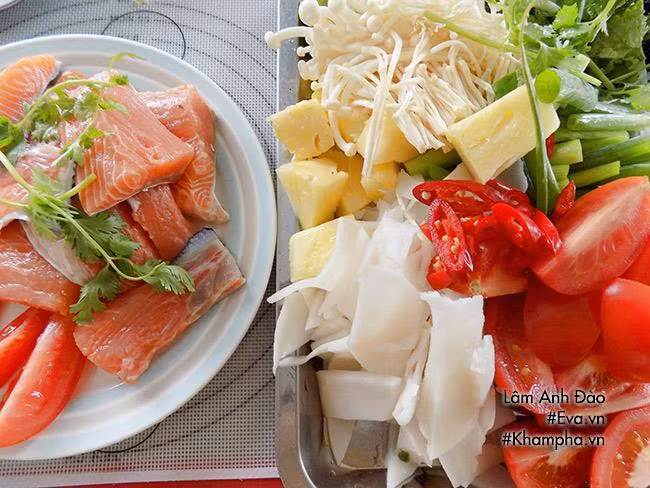 Đầu tiên, đun nước dùng gồm thảo mộc cam thảo trong 15 phút. Cá hồi ướp sơ với muối, tiêu rồi nấu khoảng 3-5 phút trong nước thảo mộc cam thảo đã đun. Sau đó vớt cá ra, trộn cùng một ít nước chanh dây bỏ hạt.