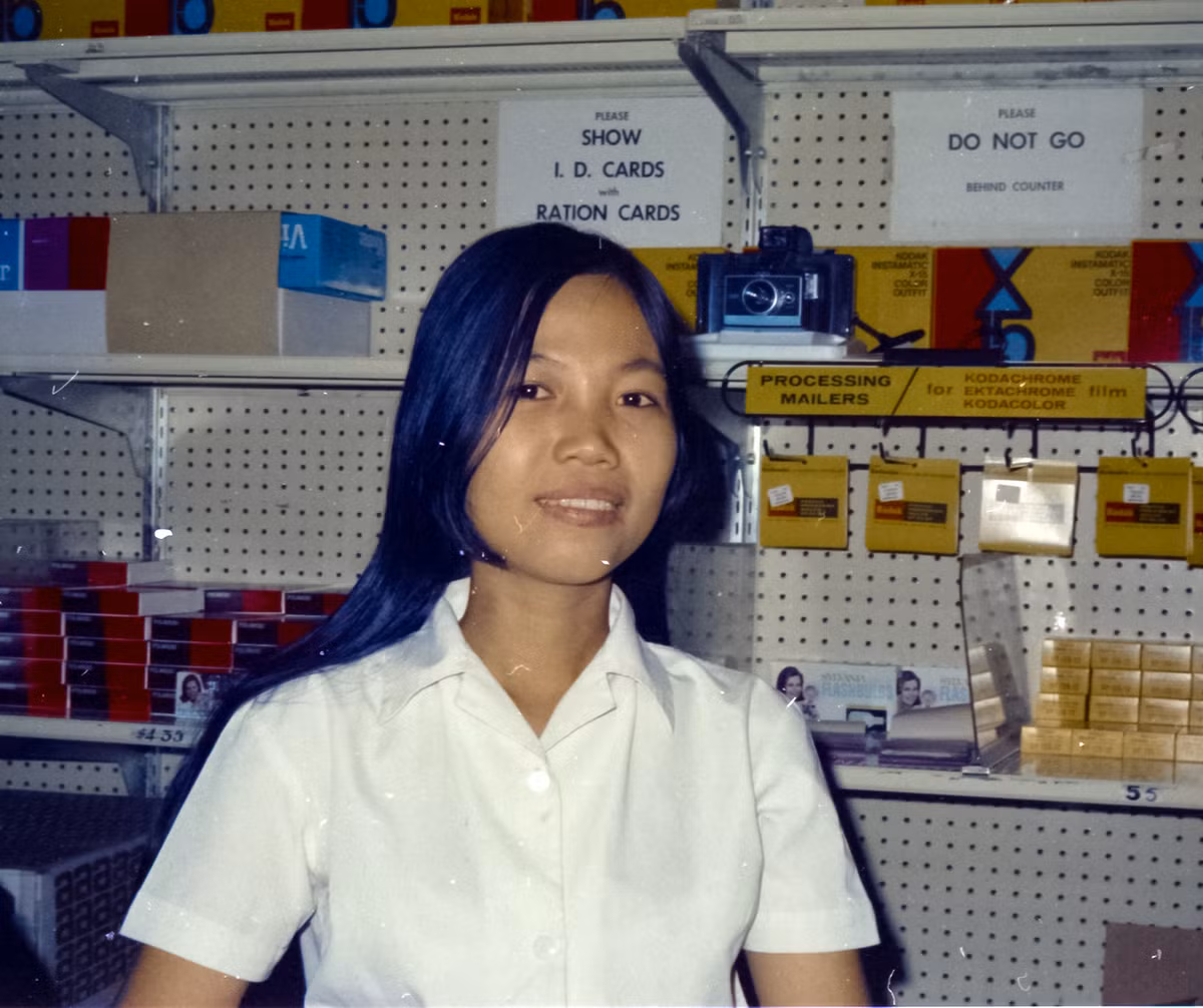 Nữ nhân viên tại một cửa hàng phân phối nhu yếu phẩm cho lính Mỹ ở Sài Gòn. Ảnh: Brian Delk Flickr.