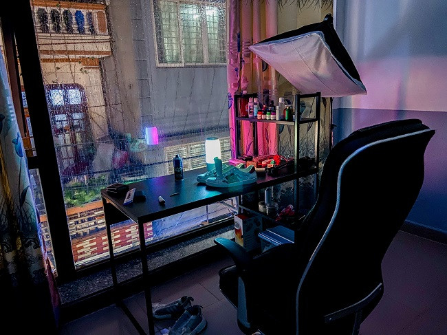 Góc làm việc nhỏ với đầy đủ "đồ nghề" chuyên dụng để vệ sinh giày thể thao và "độ" giày.