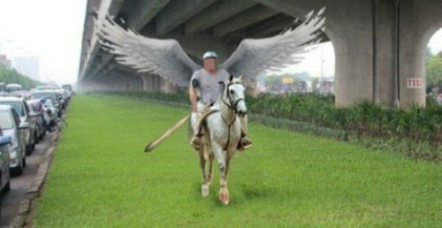 Hình ảnh nam thanh niên đi xe trên cỏ xanh khi đường vành đai 3 Hà Nội bị tê liệt sáng 8/10 đang trở thành “nguồn cảm hứng” cho dân chế ảnh.