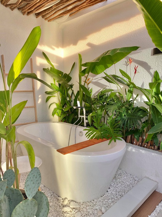 Sân thượng rộng rãi, được thiết kế bồn tắm ngoài trời và trang trí bắt mắt như một resort thu nhỏ. (Ảnh: Nguyen Quang Tam)