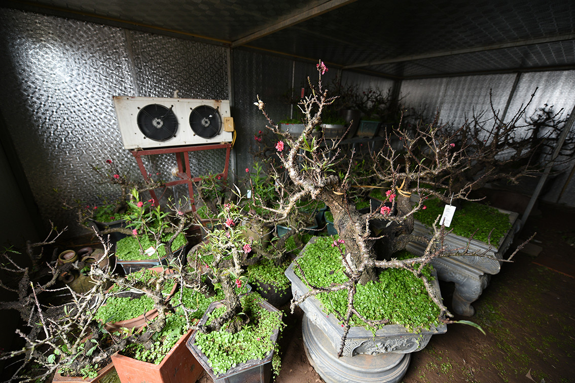 Đối với những cây có thế đẹp, người trồng đào phải dựng nhà, lắp điều hoà chạy 24/24 để chăm sóc đào Thất Thốn.