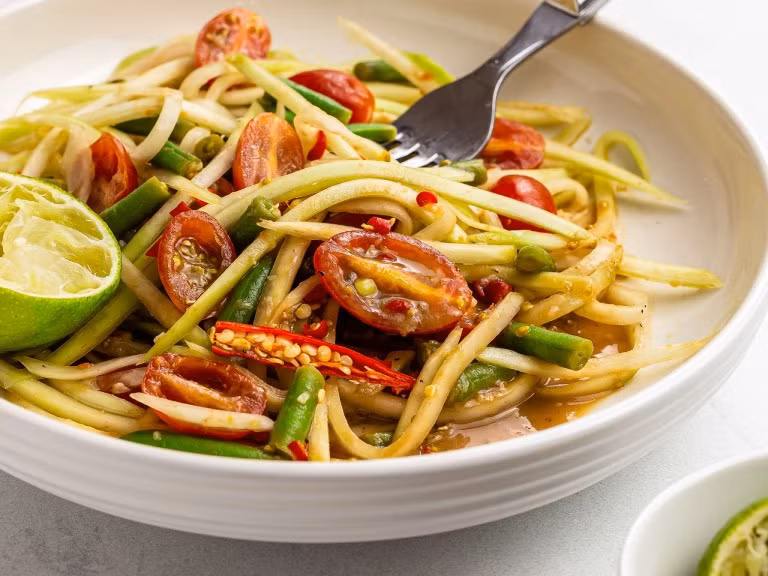 Vào bữa trưa, Jisoo sẽ dùng một khẩu phần ăn nhỏ khác. Trong một video xuất hiện cùng Lisa, nữ ca sĩ nói rằng cô ấy thích ăn món salad đu đủ gồm xà lách, đu đủ và cà chua. Tuy nhiên nếu muốn ăn cay hơn, cô sẽ cho thêm thịt gà ướp giấm, tương ớt ngọt và tiêu đen tạo nên một món vừa hấp dẫn vừa đủ chất.