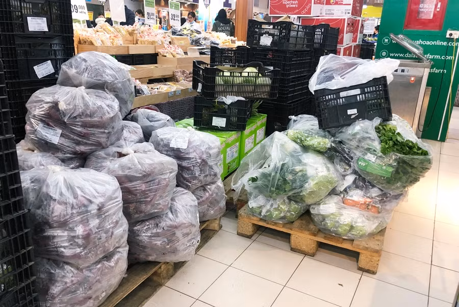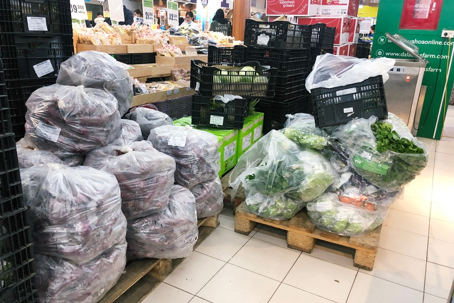 Nguồn rau dự trữ bên trong siêu thị này cung ứng liên tục ra phía quầy, kệ.