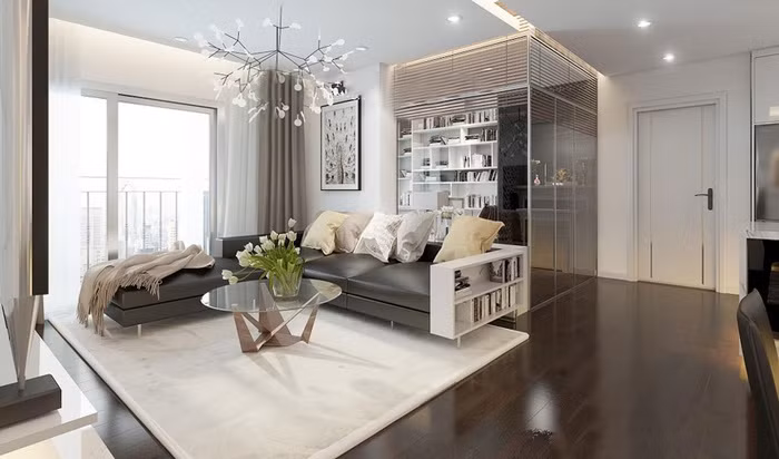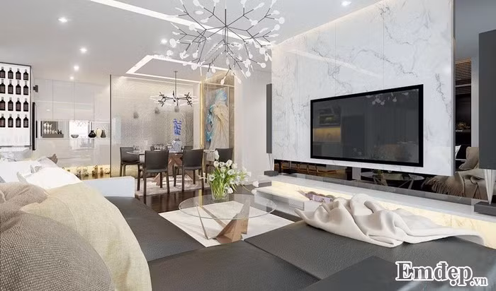 Thiết kế tổng thể căn hộ chung cư. KTS chọn màu trắng là gam màu chủ đạo cho toàn bộ căn nhà từ đèn trần đến thảm trải sàn, tường nhà...