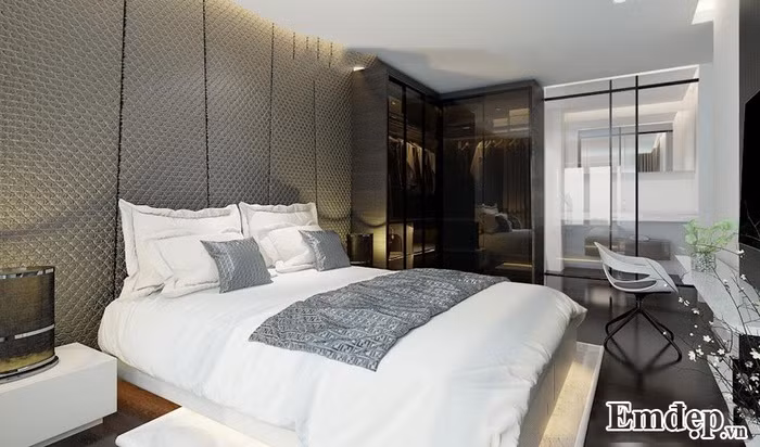Phòng ngủ của gia chủ với tường ốp 3D, nội thất trắng thật sang trọng và quý tộc.