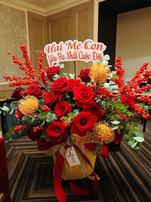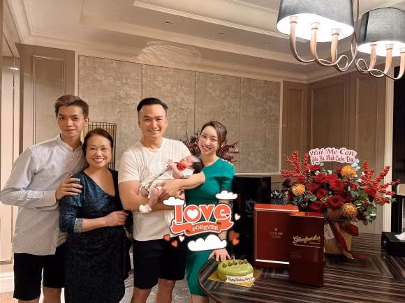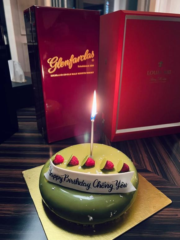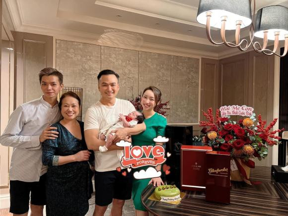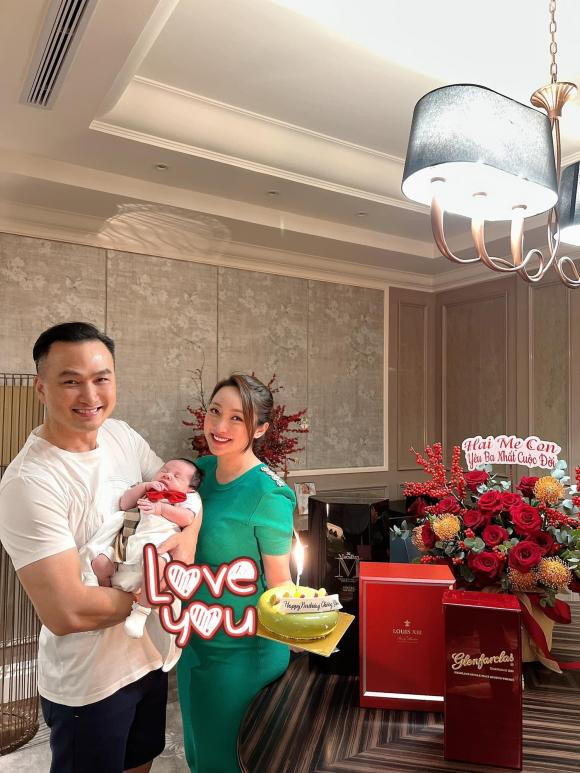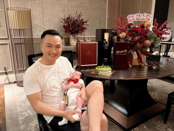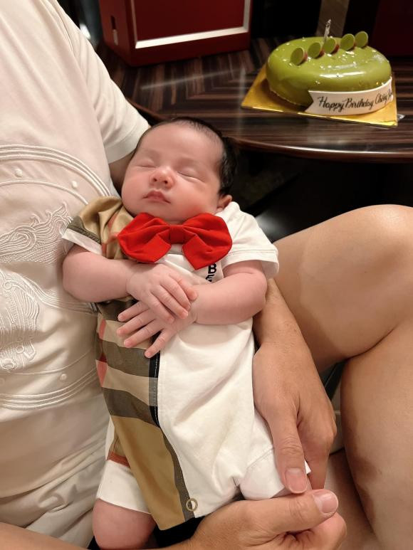 Vợ trẻ của Chi Bảo đã chuẩn bị rất chu đáo với bánh kem, hoa, quà.... để tạo không khí ấm cúng nhưng vui vẻ dù mừng sinh nhật tại nhà. Đặc biệt, cô nàng còn mang tặng chồng viên kim cương to đùng sáng chói đó là quý tử mới chào đời của cả hai. Cậu nhóc được mẹ ăn diện bảnh bao nhưng lại say ngủ khi đang chúc mừng sinh nhật bố.