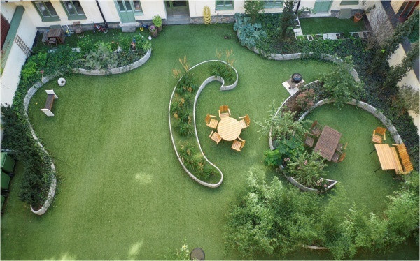 Một chút xanh tươi của cỏ nhân tạo kết hợp với bậc thềm bằng đá.