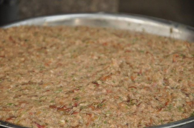 Rươi tươi kết hợp với thịt lợn, trứng và các loại gia vị, rau thơm, trộn đều và mang rán.