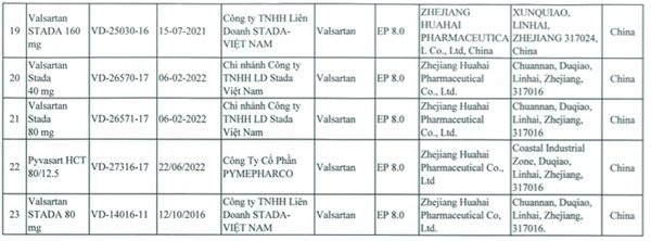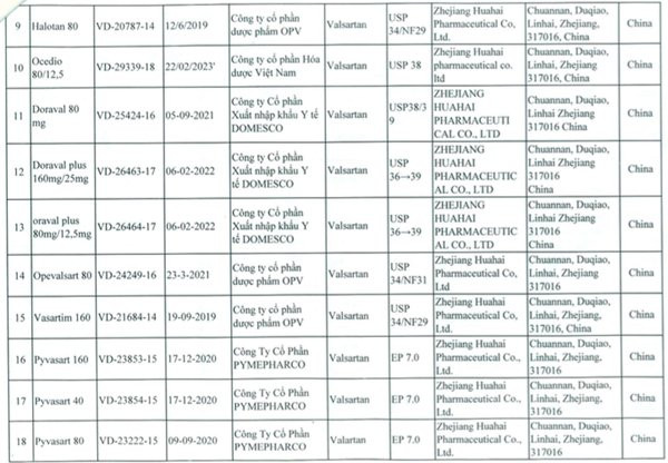 | Chi tiết 23 loại thuốc tim mạch chứa Valsartan có nguy cơ gây ung thư bị thu hồi. |