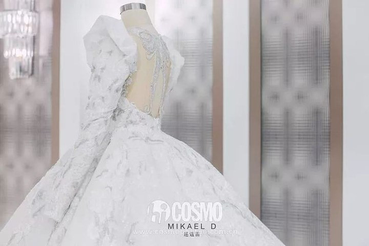 Theo Cosmo, bộ váy cưới của nữ diễn viên Đường Yên gây ấn tượng ở phần đuôi váy xòe rộng, dài 3,99 m và mất 5.600 giờ để hoàn thành.