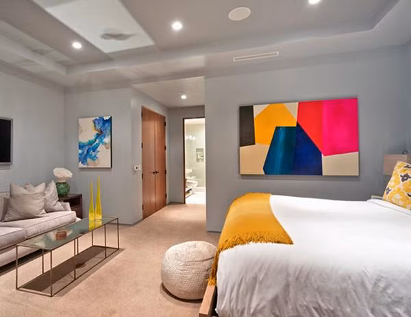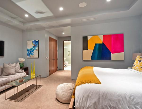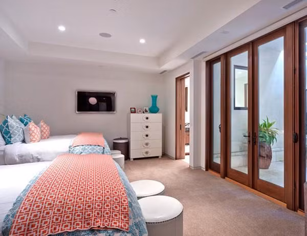 Cả sáu phòng ngủ đều được trang trí với những màu sắc rực rỡ, mang lại không gian tươi mới. Một phòng ngủ khác nổi bật với thiết kế theo chủ đề bãi biển.