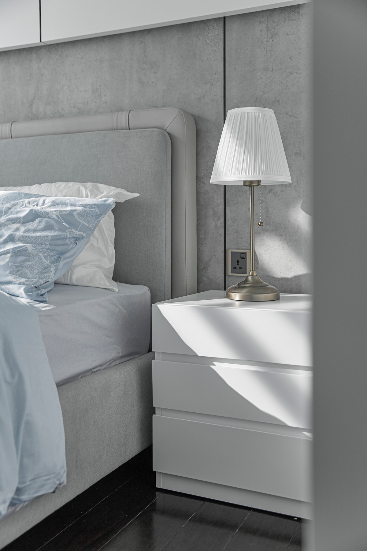 Điểm nhấn ở phòng ngủ là tông xanh nhẹ nhàng và ngọt ngào với đầu giường và đèn ngủ có màu tương đồng.