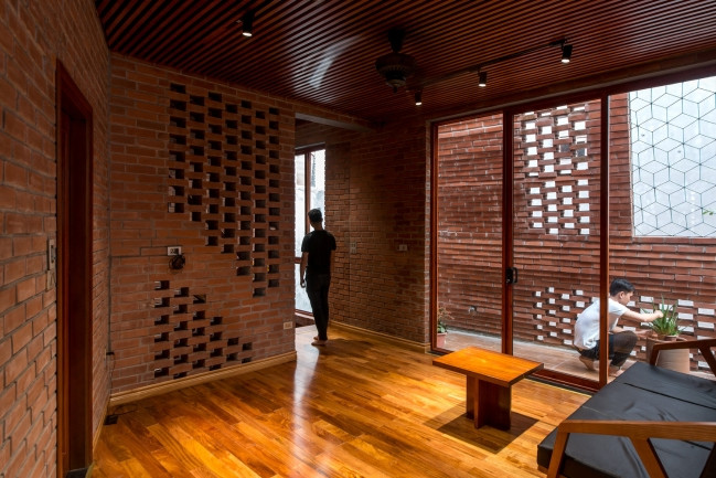 Ngôi nhà gạch có cấu trúc lạ lẫm như một hang gạch bởi những bức tường gạch 2 lớp bao quanh, xen kẽ với cây xanh. Những lớp tường này có chức năng như bộ vỏ lọc giúp loại bỏ các tác động tiêu cực từ môi trường, đồng thời, thông gió và lấy ánh sáng tự nhiên.