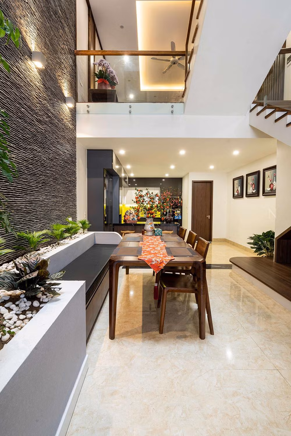 Theo đó các không gian như bếp, bàn ăn của gia đình được bố trí ở tầng 1. Tại mọi vị trí đều có bệ ngồi để bố mẹ gia chủ có thể ngồi nghỉ hay các con có thể chơi đùa khi chờ chuẩn bị ăn cơm.