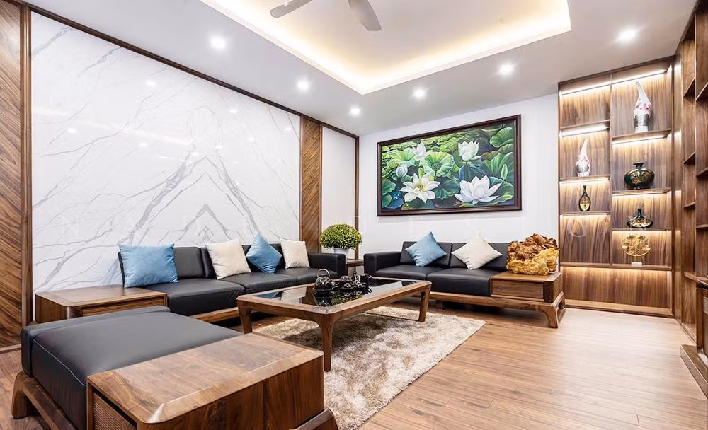 Ở phòng khách còn đặt một kệ gỗ lớn để trưng bày nhiều bình gốm quý, giúp thỏa mãn đam mê của gia chủ.