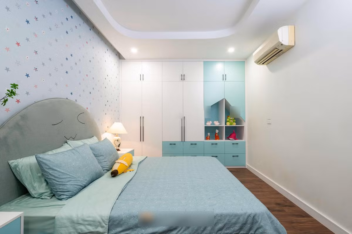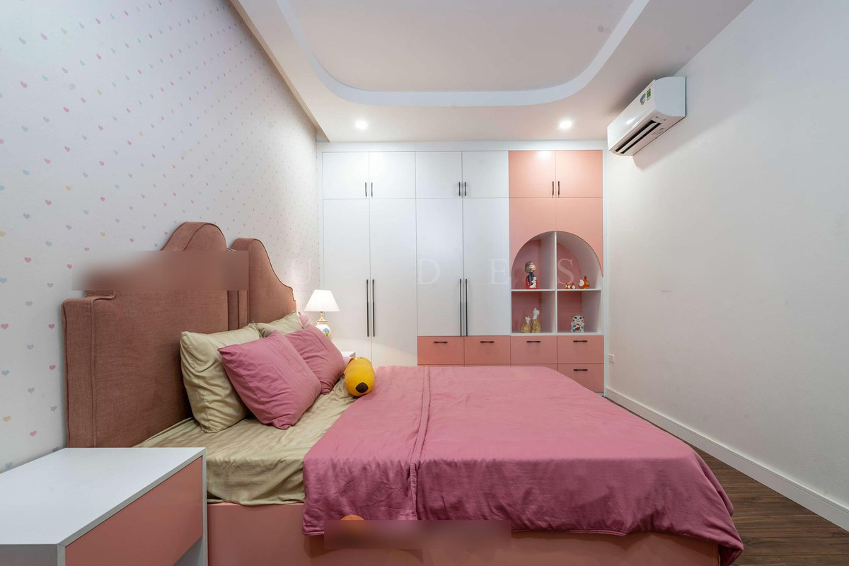Không gian phòng ngủ của bố mẹ có một ban công trồng hoa, cây cảnh và bàn làm việc cạnh cửa sổ.