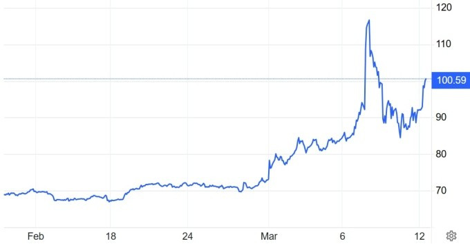 Trong phiên giao dịch sáng 12/3, hai loại dầu chủ chốt của thế giới là Brent và WTI hiện đều tăng gần 9%. Dầu Brent lên 100,4 USD một thùng, trong khi WTI giao dịch tại 95 USD.