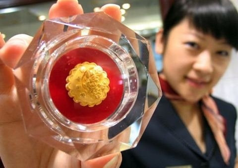 | Trung thu năm 2011, một cửa hàng vàng tại Thẩm Dương, Liêu Ninh, Trung Quốc) sản xuất những chiếc bánh trung thu làm bằng vàng ròng. |