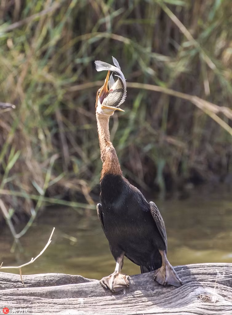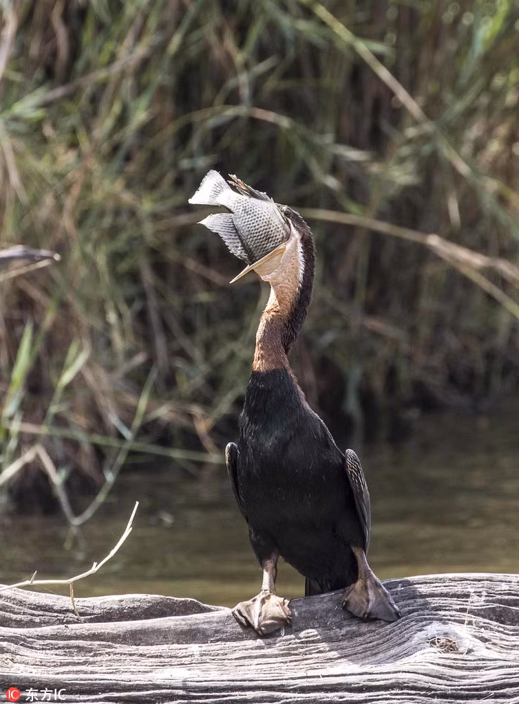 Tuy nhiên, vì không lượng sức mình, muốn một ngụm nuốt chửng con cá xuống bụng, kết quả con bồ nông cổ rắn đã bị con cá cắm trong cổ họng, muốn nuốt cũng khó mà muốn nhổ ra cũng khó. Chỉ nhìn qua ảnh cũng thấy con bồ nông vô cùng chật vật.