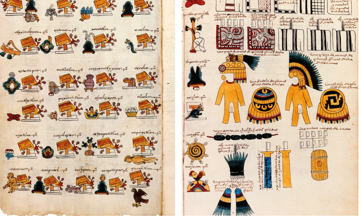 Ảnh trái: Codex Mendoza, được bảo quản ngày nay trong Thư viện Bodleian ở Oxford, Anh, được ủy quyền bởi Antonio de Mendoza, phó vương đầu tiên của Tân Tây Ban Nha, sau cuộc chinh phục - Ảnh phải: Codex Mendoza có một phần mô tả chi tiết những cống phẩm mà Moctezuma II, người đã trị vì Aztec từ năm 1502 đến năm 1520. Từ 400 thành phố dưới sự kiểm soát của mình, ông đã nhận được rất nhiều quà tặng. Trong Codex Mendoza, các ký tự tượng hình tương ứng với tên thành phố và các hình ảnh bên cạnh thể hiện sự tôn vinh của họ đối với người cai trị Moctezuma II. Nguồn: THƯ VIỆN BODLEIAN OXFORD / DAGLI ORTI / AURIMAGES