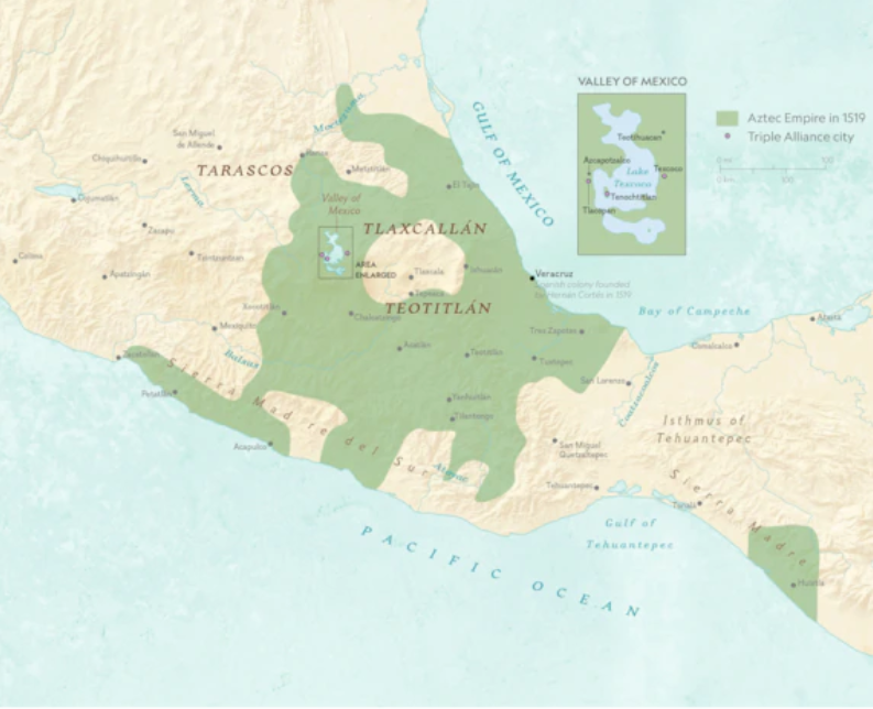 Người Aztec, một bộ tộc du mục ở miền bắc Mexico, đến Mesoamerica vào khoảng đầu thế kỷ 13. Từ thủ đô tráng lệ của họ, Tenochtitlan, người Aztec nổi lên như một lực lượng thống trị ở miền trung Mexico, phát triển một tổ chức xã hội, chính trị, tôn giáo và thương mại đa dạng, đưa nhiều thành phố trong khu vực vào quyền kiểm soát của họ vào thế kỷ 15.
