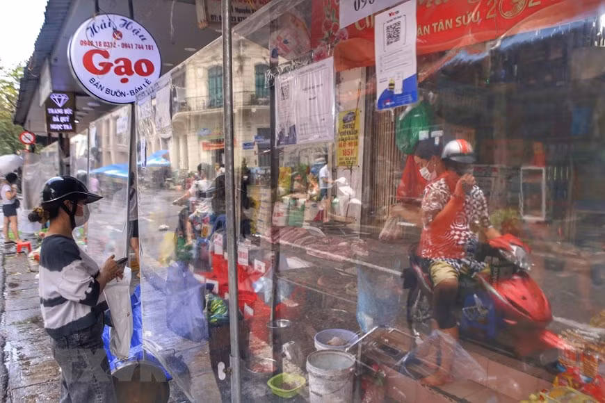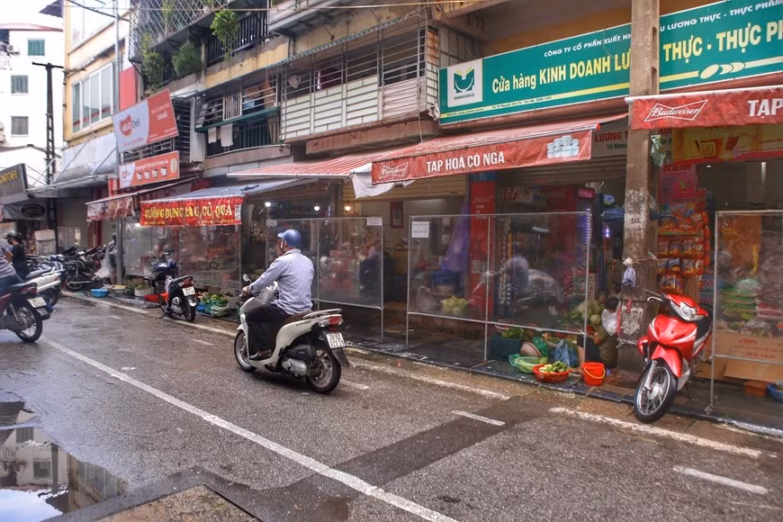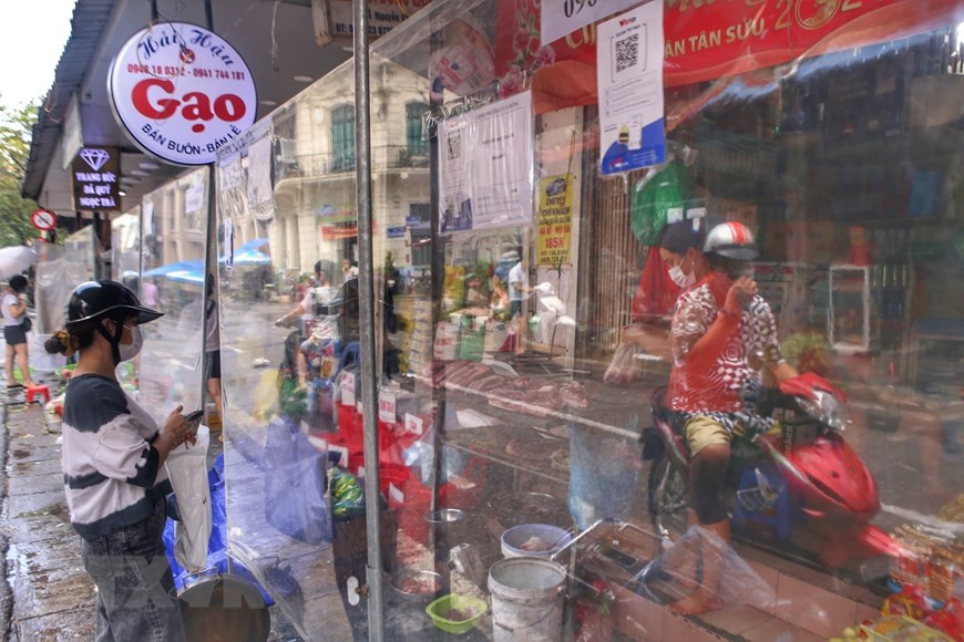 Chợ dân sinh trên phố Nguyễn Văn Tố (Hoàn Kiếm) có vách ngăn đảm bảo khoảng cách giữa người bán và người mua.(Ảnh: Tuấn Đức/TTXVN)