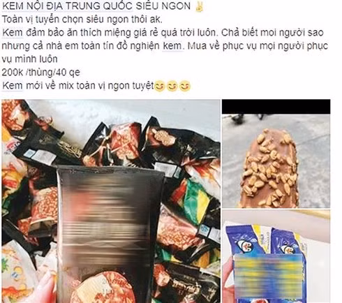 Đầu mùa hè, trên Internet xuất hiện những lời rao bán các loại kem nhiều màu sắc với giá siêu rẻ. Nguồn gốc của các loại kem này đến từ Trung Quốc. Chị Ngân Khánh (trú tại Hà Đông) đăng trên "chợ cư dân" một chung cư tại Dương Nội rao bán loại kem nội địa Trung Quốc.