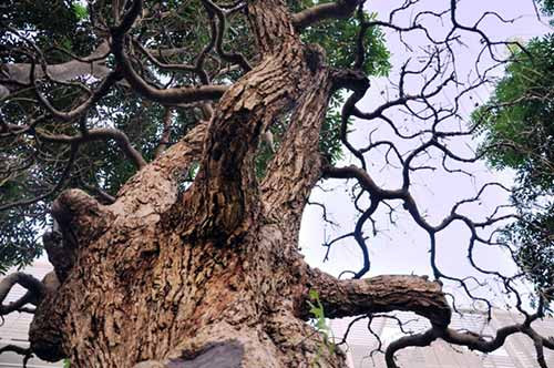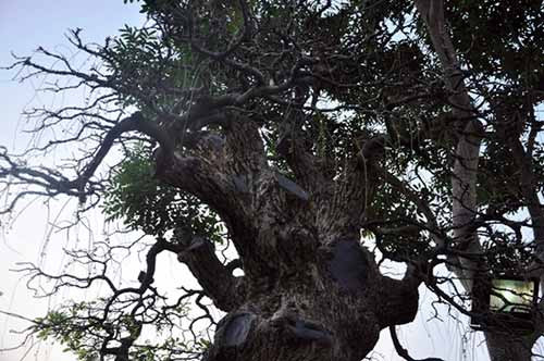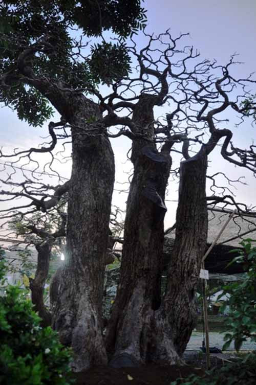 Trong đó, có cặp lộc vừng 150 tuổi cao gần 4m nặng gần 4 tấn. Thân cây sù sì, trên phần ngọn và ở mỗi nhánh đều ra trái. Theo nghệ nhân Phương, cặp lộc vừng này đã được ông mua về chăm sóc đến nay đã hơn chục năm. Hiện cây đã ra hoa và trái, nếu bán cặp này phải 4 tỷ đồng, nghệ nhân Phương mới đồng ý bán.