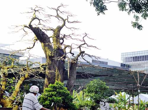 Đó là dàn lộc vừng kiểng khủng của nghệ nhân Mai Xuân Phương (ngụ thành phố Thủ Dầu Một, tỉnh Bình Dương) mang đến Hội hoa xuân Phú Mỹ Hưng, quận 7, TP.HCM. Dù đặt ở phía bên hông của Hội hoa xuân nhưng dàn cây khủng của nghệ nhân Phương luôn được nhiều người đến tham quan và thưởng thức. Ai cũng chăm chú nhìn và trầm trồ khen ngợi những cây bonsai đẹp, có dáng “độc”.