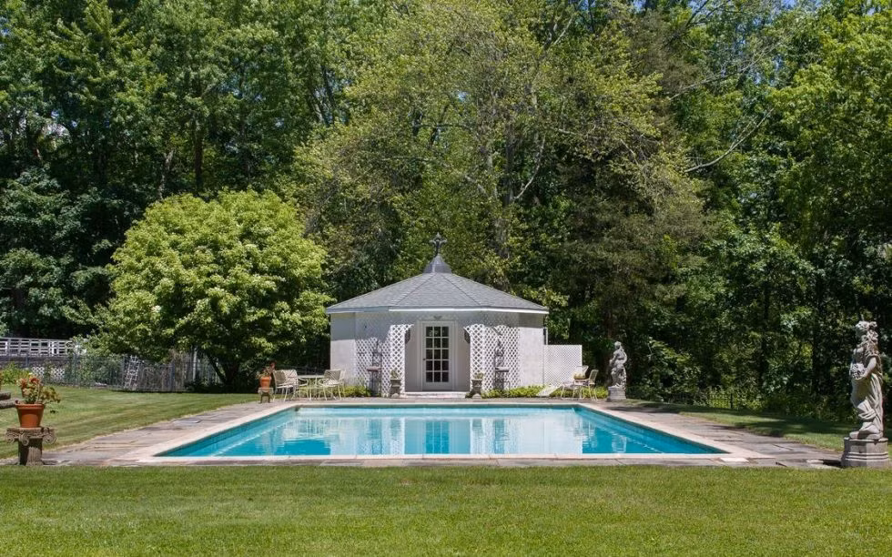Trước nhà là một bể bơi rộng gần 100 m², ngay bên cạnh là phòng nghỉ tiện nghi có cả bếp, mọi người có thể vào tránh nắng sau khi ngâm mình trong nước.