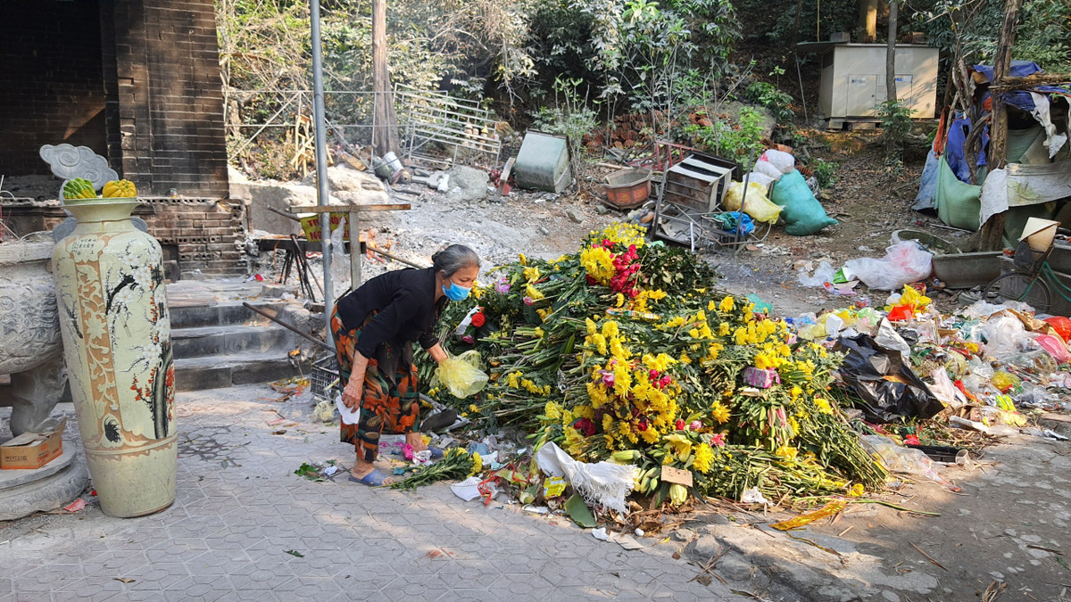 Những bao bạc thỏi, vàng mã chất dọc đường vào, cạnh các ki ốt chờ phục vụ khách thập phương.
