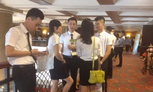 Từ sáng sớm khu vực tổ chức thi tuyển tiếp viên hàng không đã khá đông thí sinh tới đăng ký, nộp hồ sơ, với trang phục dự thi là nữ váy đen sơ mi trắng, nam sơmi trắng phối cà vạt và quần tây đen. Dàn trai xinh gái đẹp nổi bật đã thu hút không ít sự chú ý của mọi người khi đi qua sảnh khách sạn.