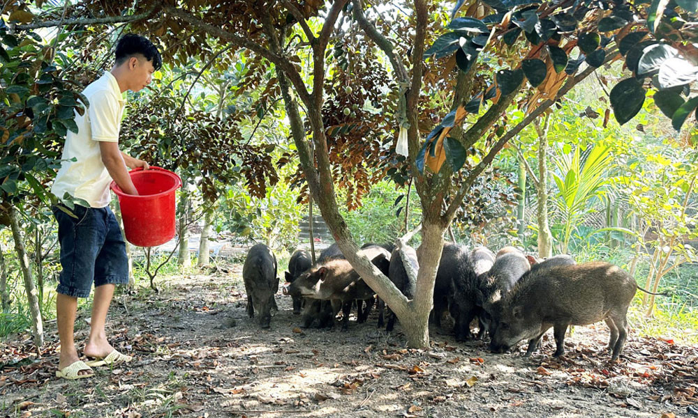 Anh Nguyễn Tấn Đạt (Sóc Trăng) cũng áp dụng nuôi lợn rừng bằng trái cây kết hợp đậu nành, hèm bia, mỗi năm thu lãi hơn 800 triệu đồng.