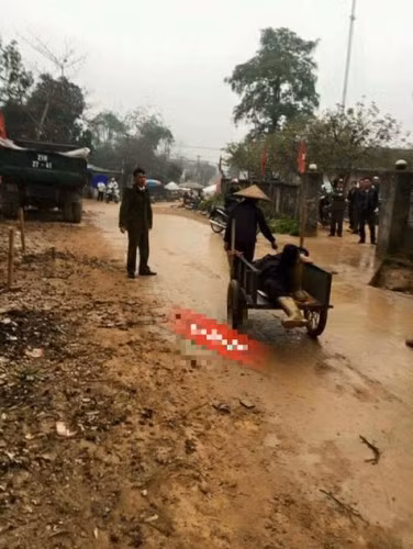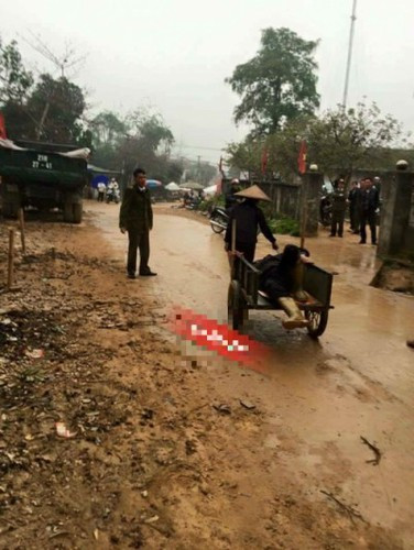 Chồng không đứng vững nổi, nên cô vợ phải lấy dây cột lại, để nằm lên yên xe rồi một tay ôm người, một tay dắt xe đi.