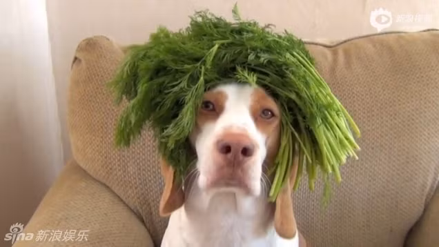 Chú chó này đội đủ thứ rau củ trên đầu, từ lá bắp cải...