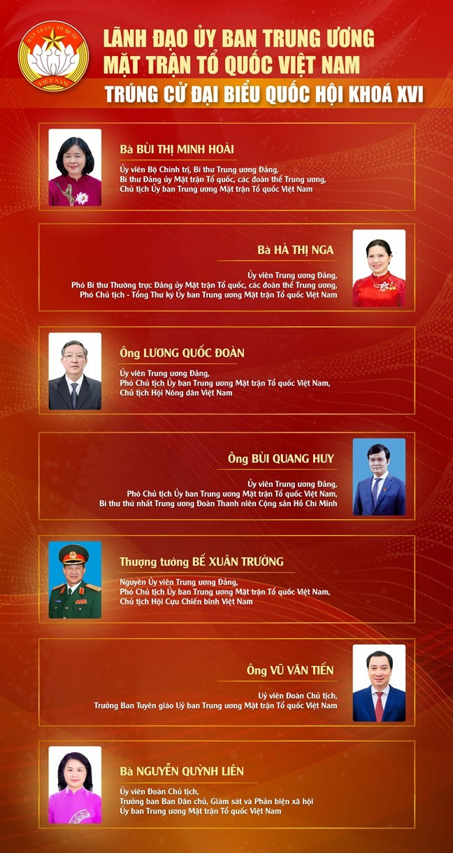 Theo danh sách công bố, Ủy viên Bộ Chính trị, Bí thư Trung ương Đảng, Chủ tịch Ủy ban Trung ương MTTQ Việt Nam Bùi Thị Minh Hoài; Ủy viên Trung ương Đảng, Phó Chủ tịch – Tổng Thư ký Ủy ban Trung ương MTTQ Việt Nam Hà Thị Nga cùng 5 vị Ủy viên Đoàn Chủ tịch Ủy ban Trung ương MTTQ Việt Nam trúng cử đại biểu Quốc hội khoá XVI.