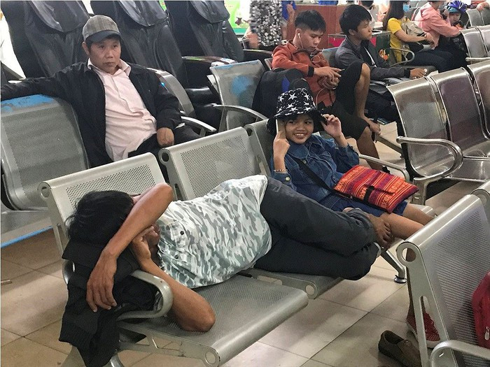 Do lượng người rời TPHCM về quê đông khiến các tuyến đường thường xuyên kẹt xe, nhiều người phải đến bến xe sớm tránh trễ chuyến phải ngồi, nằm vật vờ ở ghế chờ.