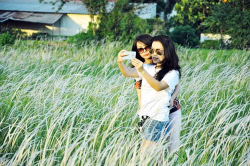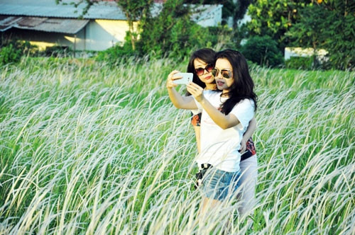 Nhiều bạn trẻ tìm đến cánh đồng cỏ lau để ghi lại khoảnh khắc đẹp.