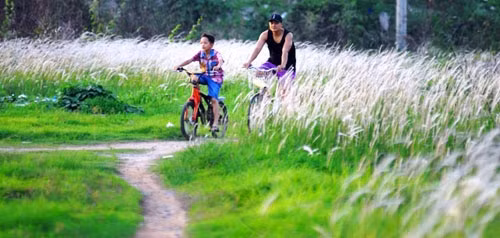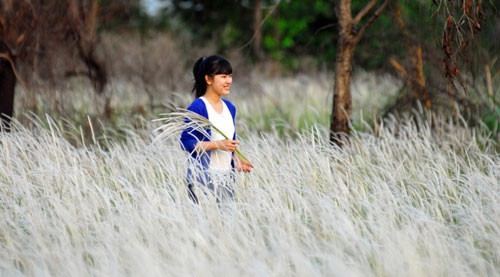 Cả cánh đồng cỏ lau rợp màu trắng, ẩn hiện trong màu xanh gốc lau.