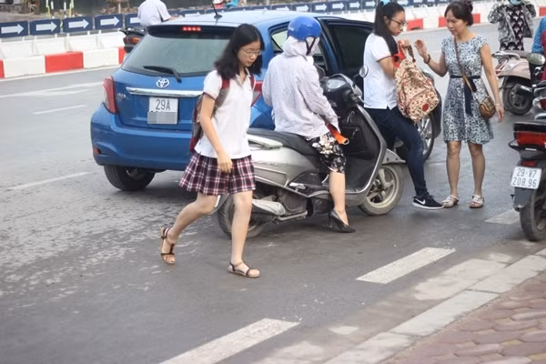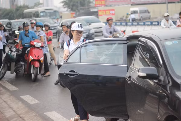Nữ sinh vừa bước xuống ô tô vừa ôn bài.