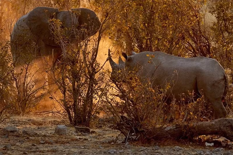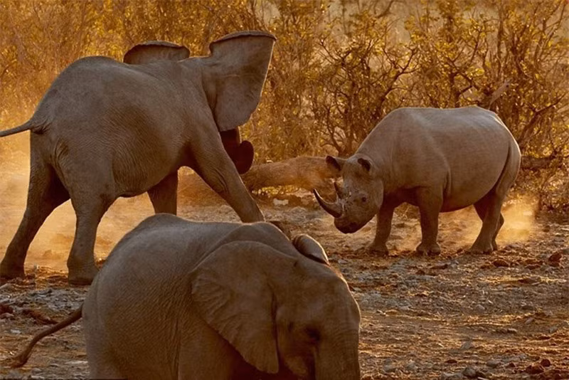 Sau nhiều ngày mục kích, cuối cùng nhiếp ảnh gia động vật hoang dã Andrew Forsyth đã ghi lại được khoảnh khắc tê giác đại chiến với voi rừng tại công viên quốc gia Etosha, Cộng hòa Namibia (Nam Phi).