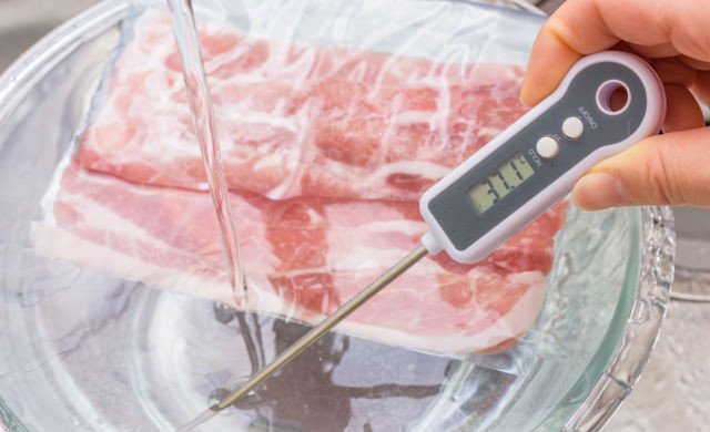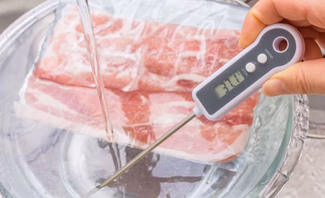 Cho miếng thịt đựng trong túi zip vào bát rồi đổ nước ấm khoảng 35 – 40 độ C, tốn 4 phút để rã đông miếng thịt 100g.