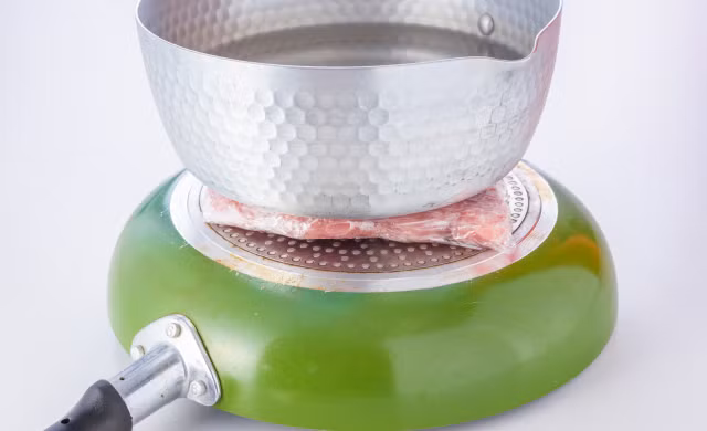 Đây là phương pháp rã đông sử dụng tính dẫn nhiệt của nhôm. Đặt miếng thịt trên đáy chảo, đổ nước ẩm 30 – 35 độ C lên nồi nhôm đặt bên trên. Nếu là thịt vụn hoặc thịt đã thái móng, có độ dày 1cm trở xuống có thể áp dụng cách rã đông này, tốn khoảng 4 – 5 phút.