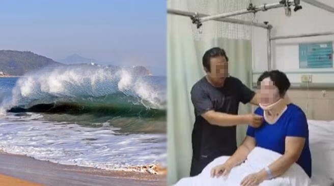 Đúng lúc đó, gió to sóng lớn xuất hiện, do không có kinh nghiệm, cô Trương lập tức bị một ngọn sóng lớn đập thẳng vào người và ngã xuống.