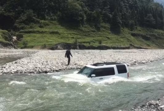Không thể lái xe ra khỏi lòng sông, chủ xe đã phải từ bỏ chiếc xe của mình và chạy lên bờ. Nhìn chiếc xe bị dìm trong nước, bản thân lại mắc kẹt ở bãi bồi giữa sông, người đàn ông nhanh chóng gọi điện thoại xin giúp đỡ.